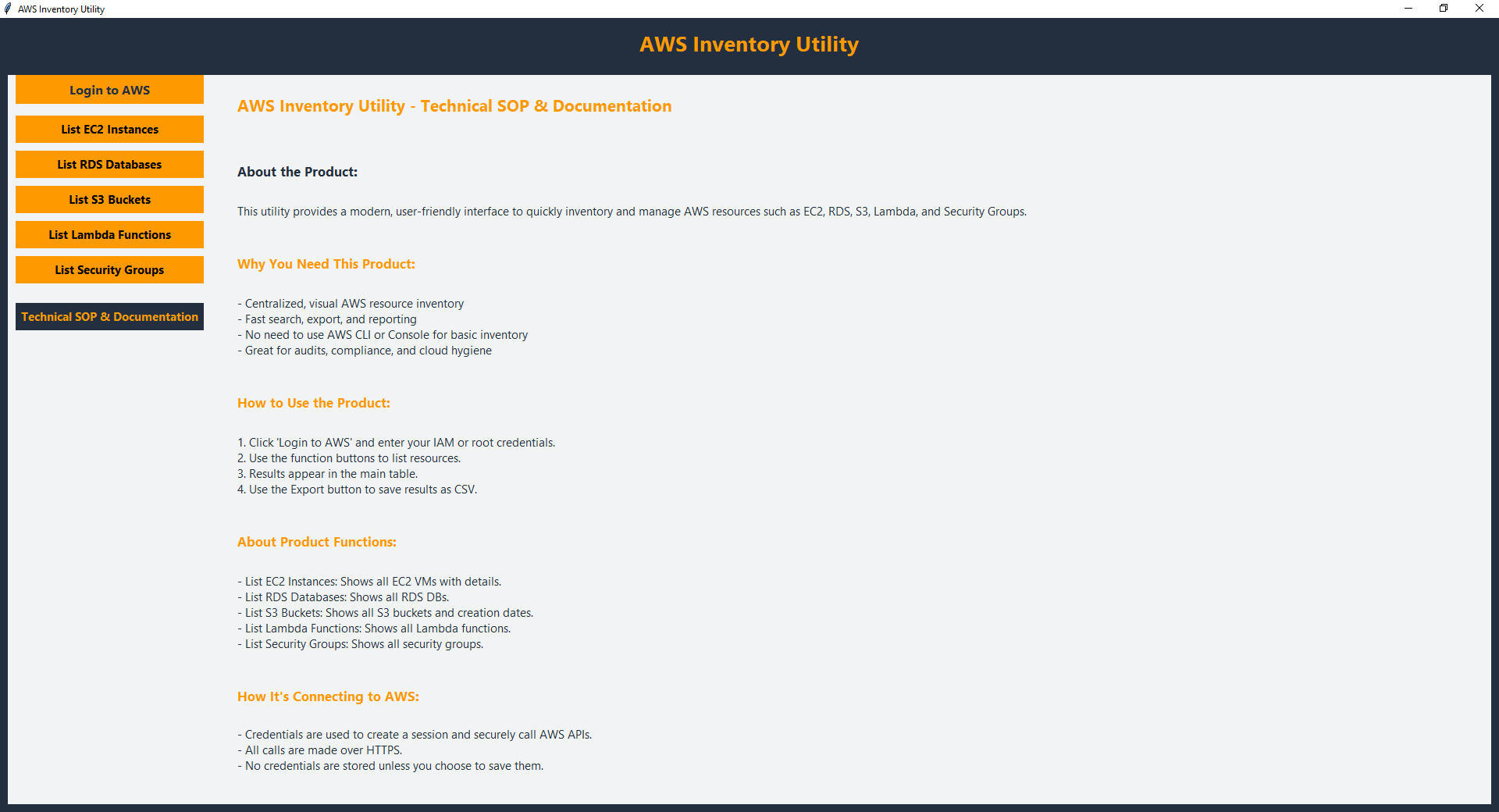 AWS Inventory Utility is your trusty sidekick for taming the wilds of Amazon Web Services. Forget endless CLI commands and cryptic dashboards—this app gives you a crystal-clear, one-stop view of your EC2s, S3 buckets, RDS databases, Lambdas, and more. With a modern AWS-themed interface and real-time updates, you’ll always know what’s running, where, and why (and maybe even how much it’s costing you).